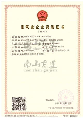 湖北省南山古建园林工程有限公司是一家集仿古建筑、市政公用工程、景观绿化、文物修缮、建筑装饰、园林古建设计等多项于一体的施工企业,拥有仿古建筑工程、市政公用工程三级、建筑施工总承包三级、园林绿化工程三级、文物修缮工程三级等多项施工资质。注册资金2100万。 公司成立于2016年5月10日;公司地址位于“中国园林古建之乡”——湖北省大冶市。